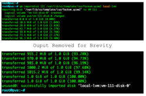 Example – qm importdisk 111 /var/lib/vz/template/iso/fackvm.qcow2 local-lvm.