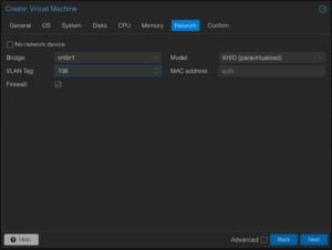 7. Network – Select your bridge (e.g., vmbr1). Set the Model to VirtIO (paravirtualized).