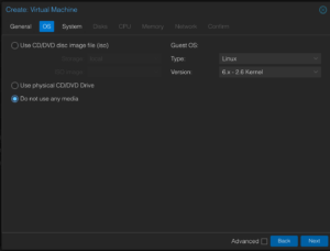 3. OS – Select Do not use any media. Set Type to Linux and Version to 6.x - 2.6 Kernel.