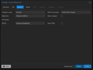 4. System – Leave defaults (ensure QEMU Agent is off unless you plan to install it later).