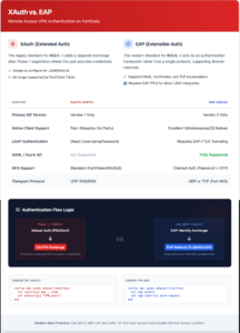 • IKEv2 does not support XAuth; instead it uses EAP (for example EAP‑MSCHAPv2, EAP with MFA, etc.) for user auth, which is more flexible and better aligned with modern identity systems.