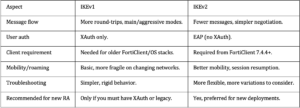 • If your design requires XAuth specifically (for example existing RADIUS policies built around it), you must stay with IKEv1; if you want modern EAP‑based auth and better MFA integration, use IKEv2.