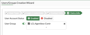 I will skip over to section 4, Ensure that the status is Enabled and in the User Group select the proper group.  In my configuration username agentless1 Is a contractor and agentless2 Is part of the sales team.