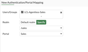 You will choose the group by selecting it in the Users/Groups section.  Under Realm you need to change to Specify then choose the realm.  Next we choose the corresponding portal (in our case Sales).