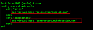 You will need to go to config vpn ssl web realm then edit your realm .  In my case edit sales and enter set virtual-host "sales.myinfoseclab.com" and edit contractors and set virtual-host "contractors.myinfoseclab.com" .