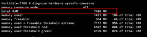 If you want to check the memory your device has, type the following command diagnose hardware sysinfo conserve .  The output should look something like this.