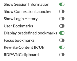 5. Focus Bookmarks – controls the layout of the web portal, specifically telling the system to display the bookmarks section prominently (focused) above the Quick Connection tool, giving users immediate access to pre-defined or personal application links rather than the quick-access bar.  If you are removing all the other options, this is moot.
