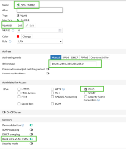 Here we have a VLAN where my FortiNAC’s port2 will communicate with my FortiGate. I created a new VLAN 369 and assigned an IP address to it of 10.241.249.1/24. I enabled ping and enabled the Block Intra-VLAN traffic.