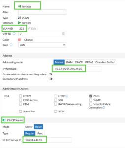 In this VLAN, we configure it as a DHCP Relay Server to the IP address of Port2 on the FortiNAC (10.241.249.10 which we will be configured later).