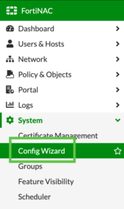 Once you have an IP address on your FortiNAC and you have licensed it through support.fortinet.com, and you have the basic dashboard, you can go to System then Config Wizard