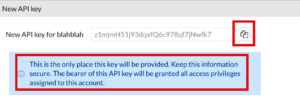 NOTE: You need to store this API key.  You have only this one time to capture it.  If you miss it or missplace it, you will need to regenerate it.  If you have other devices using this particular API key, you willl need to visit all of them to update them.