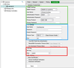 You will need to add the IP address of the FortiGate.  Once there you will need to add the SNMPv3 credentials, the CLI credentials (the Administrator account), and finally the API key from the previous steps.  Choose to Validate Credentials