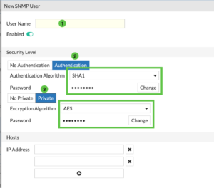 Give it a User Name (1) then we are going to ensure you have the Authentication and you hit the Change to add a password and do the same with the Private and add a password on that one as well.  You can choose SHA1 as the Authentication Algorithm and AES for Encryption Algorithm