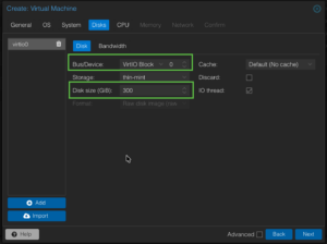 Now in Disk, I chose the VirtIO Block for the Bus/Device as I read it give better performance. Give it how much space you want to allocate to EVE-NG then click Next.