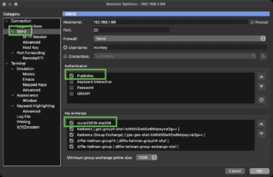 Under the SSH2 of the Session page, you should disable all authentication methods except for PublicKey. Additionally, you should enable and re-position the curve25519-sha256 at the start.