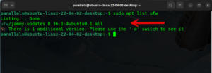 We can do this by typing sudo apt list ufw and enter. You can see where the red arrow is after the word all there is nothing. This means it did not find it on my system.