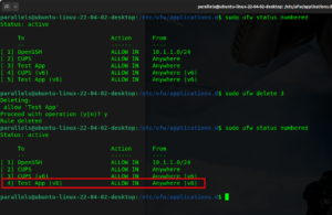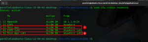 When you want to view the configuration of the UFW rules or policies, you can use the sudo ufw status numbered and the policies will show a number.