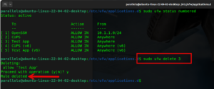 Now we want to delete rule number 5, your first instinct is to say, “I already know I want to delete rule 3 and rule 5” so the logical command you would run would be sudo ufw delete 5 however …….